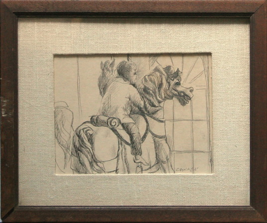 Pencil, 5-1/4 x 7, in 11-1/4 x 15-1/2 glassed Milstein frame. Signed. Frame scarred and damaged.