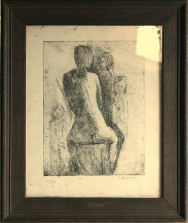 Print, image 6 x 7-3/4, in glassed Milstein frame, 11 x 12-3/4. Signed. Reflection is photo artifact.
