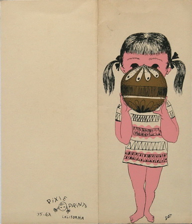 'Pixie Prints' silk-screened greeting card, 4 x 9-1/4 (front and back; see A-4B for interior). Image by Dorothy, signed 'Dot'.
